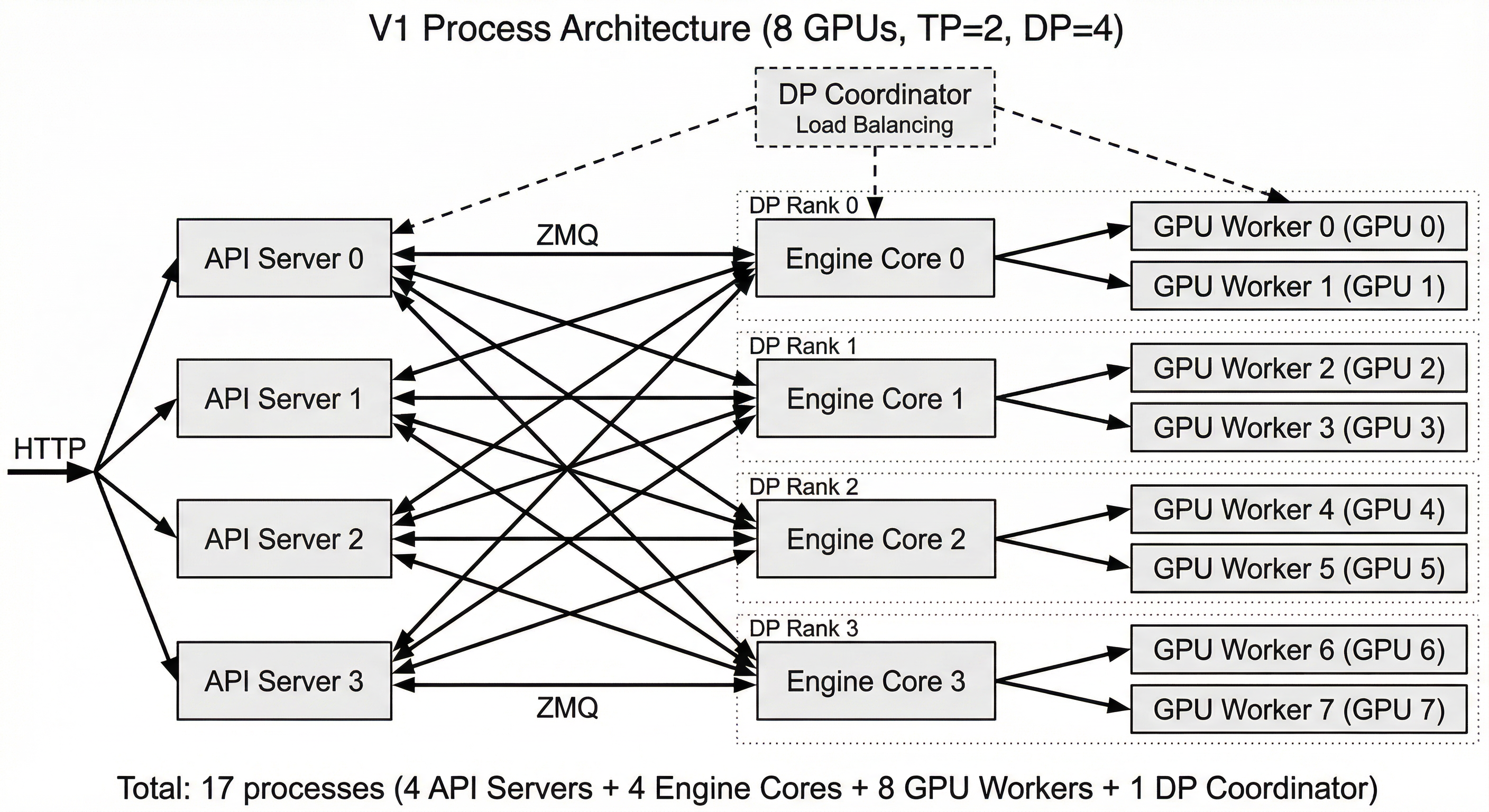 - 4 API servers + 4 engine cores + 8 GPU workers + 1 DP coordinator = 17 processes
